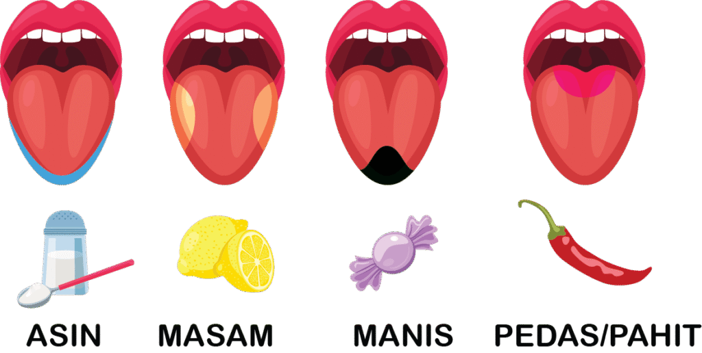 – Pedas/Pahit : biasanya terasa di bagian belakang lidah. Rasa ini sering berasal dari kafein, obat-obatan, atau sayuran tertentu.